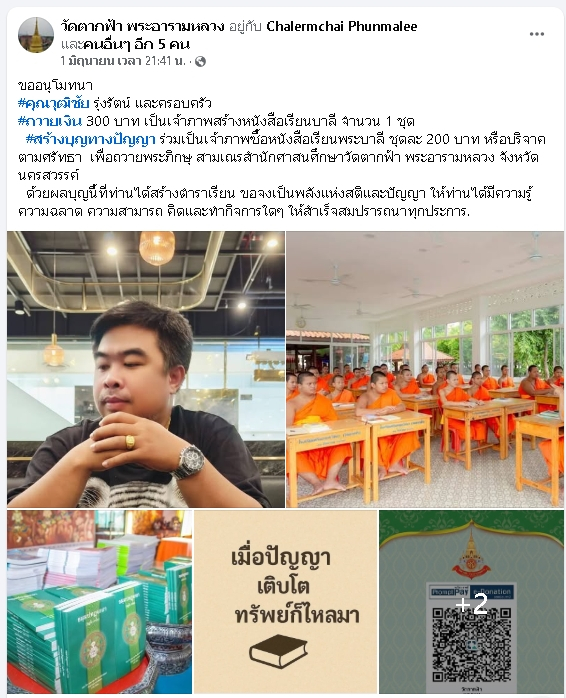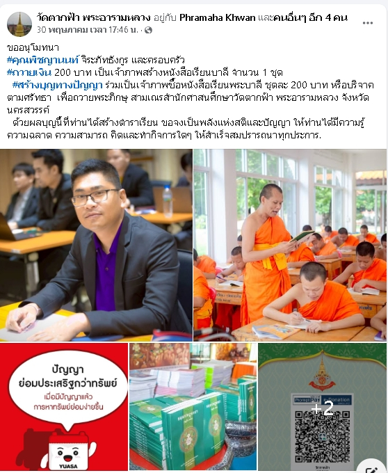 | ขออนุโมทนา คุณพิชญานนท์ จิระภัทธังกูร และครอบครัว ถวายเงิน 200 บาท เป็นเจ้าภาพสร้างหนังสือบาลี จำนวน 1 ชุด เพื่อถวายพระภิกษุ-สามเณรวัดตากฟ้า พระอารามหลวง | ||