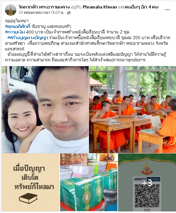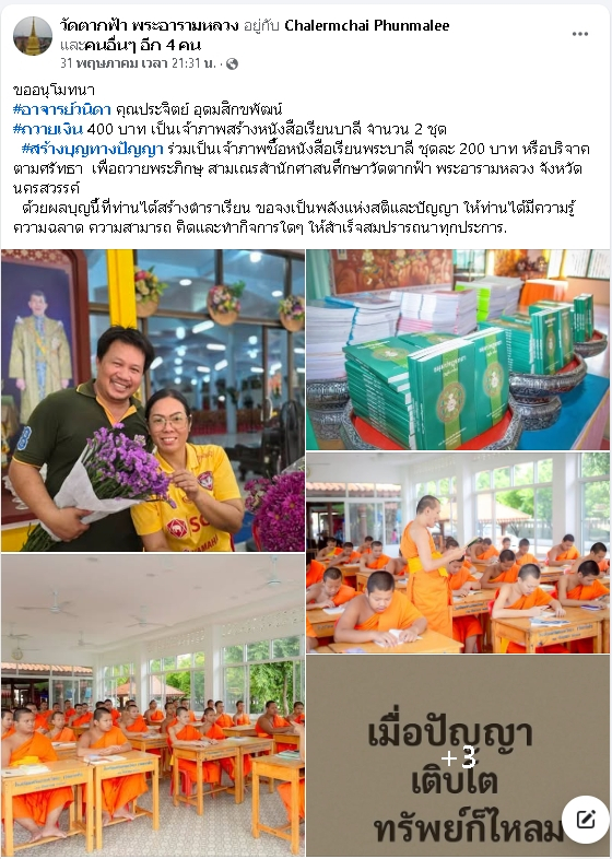 | ขออนุโมทนา คุณครูวนิดา ผลพละ-คุณประจิตย์ อุดมสิกขพัฒน์ ถวายเงิน 400 บาท เป็นเจ้าภาพสร้างหนังสือบาลี จำนวน 2 ชุด เพื่อถวายพระภิกษุ-สามเณรวัดตากฟ้า พระอารามหลวง | ||