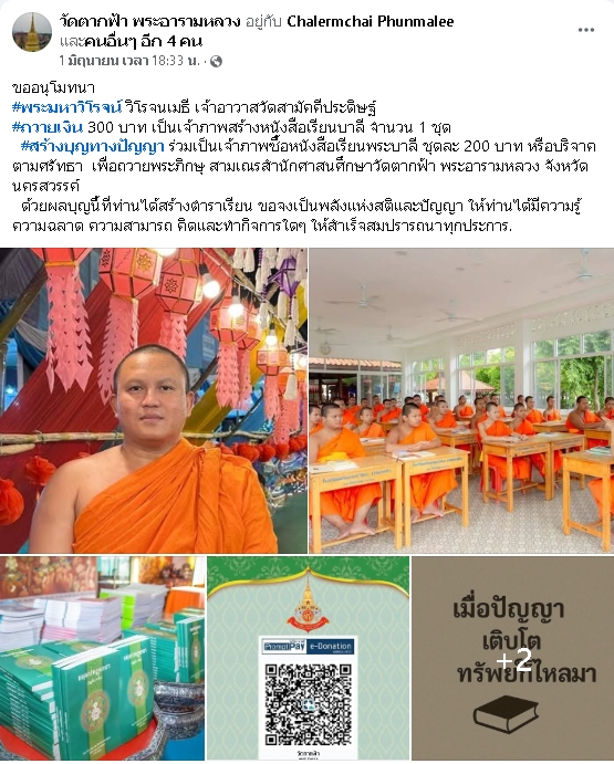 | ขออนุโมทนา พระมหาวิโรจน์ วิโรจนเมธี เจ้าอาวาสวัดสามัคคีประดิษฐ์ ถวายเงิน 300 บาท เป็นเจ้าภาพสร้างหนังสือบาลี จำนวน 1 ชุด เพื่อถวายพระภิกษุ-สามเณรวัดตากฟ้า พระอารามหลวง | ||