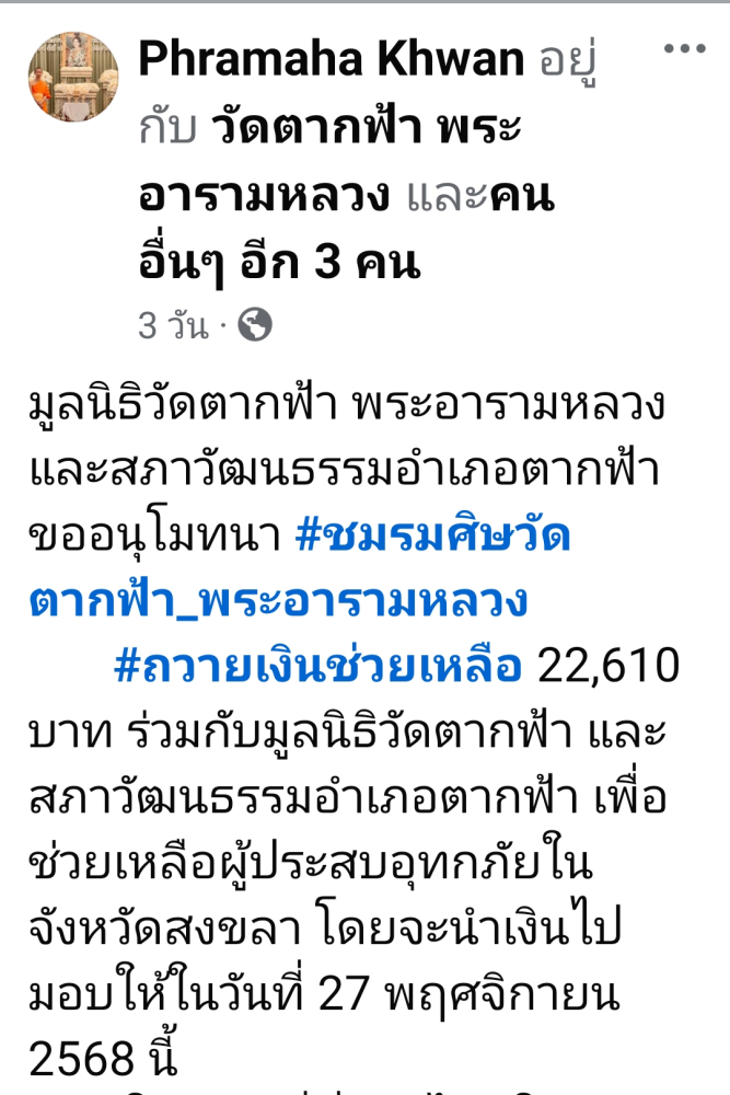| ขออนุโมทนา ชมรมศิษย์วัดตากฟ้า พระอารามหลวงร่วมบริจาค 22,610 บาท ร่วมกับมูลนิธิวัดตากฟ้าพระอารามหลวง และสภาวัฒนธรรมอำเภอตากฟ้า เพื่อช่วยเหลือผู้ประสบอุทกภัยในจังหวัดสงขลา | ||