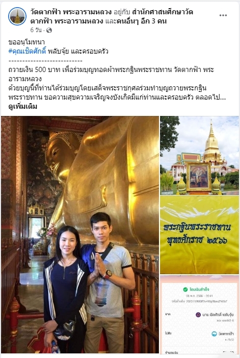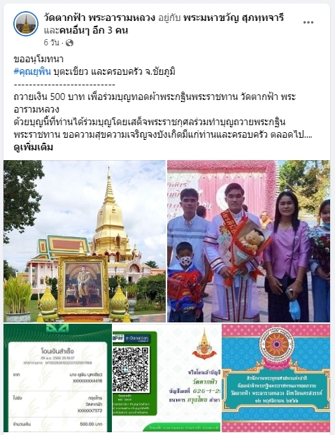 | ขออนุโมทนา คุณเชิดศักดิ์ พลับจุ้ย และครอบครัว ถวายเงิน 500 บาท เพื่อร่วมบุญทอดผ้าพระกฐินพระราชทาน วัดตากฟ้า พระอารามหลวง | ||