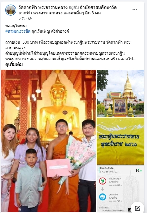 | ขออนุโมทนา คุณเจษฎา บุตะเขียวและครอบครัว ถวายเงิน 500 บาท เพื่อร่วมบุญทอดผ้าพระกฐินพระราชทาน วัดตากฟ้า พระอารามหลวง | ||
