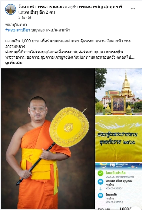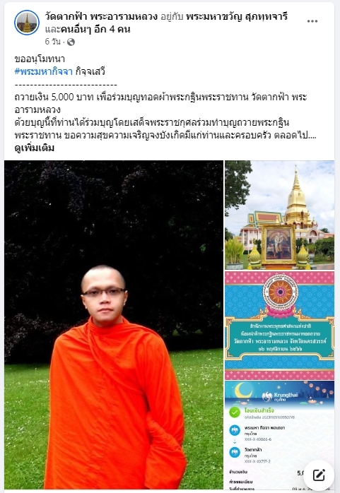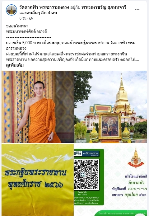 | ขออนุโมทนา พระมหาพงษ์ศักดิ์ ทองดี ถวายเงิน 5,000 บาท เพื่อร่วมบุญทอดกฐินพระราชทานวัดตากฟ้า พระอารามหลวง | ||