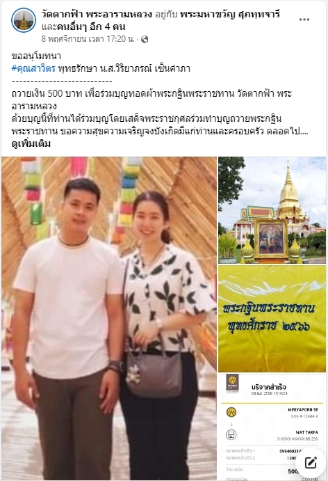 | ขออนุโมทนา คุณสาวิตร พุทธรักษา คุณวิริยาภรณ์ เซ็นคำภา ถวายเงิน 500 บาท เพื่อร่วมบุญทอดผ้าพระกฐินพระราชทาน วัดตากฟ้า พระอารามหลวง | ||