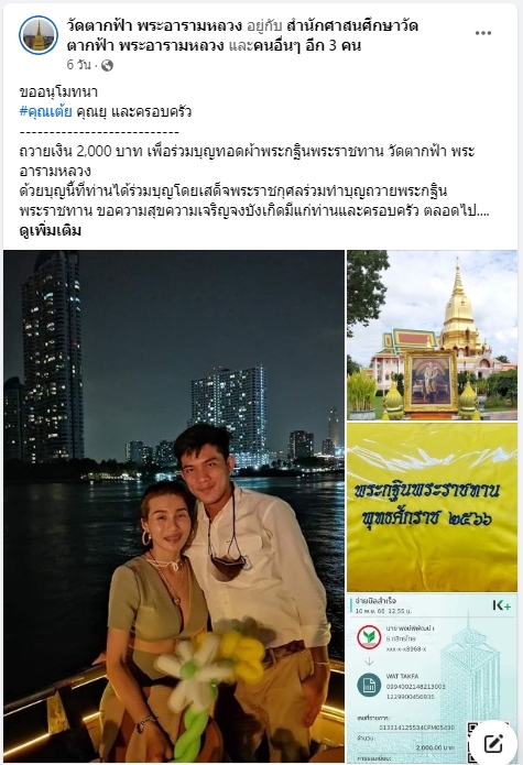 | ขออนุโมทนา คุณเต้ย-คุณยุ ถวายเงิน 2,000 บาท เพื่อร่วมบุญทอดกฐินพระราชทานวัดตากฟ้า พระอารามหลวง | ||