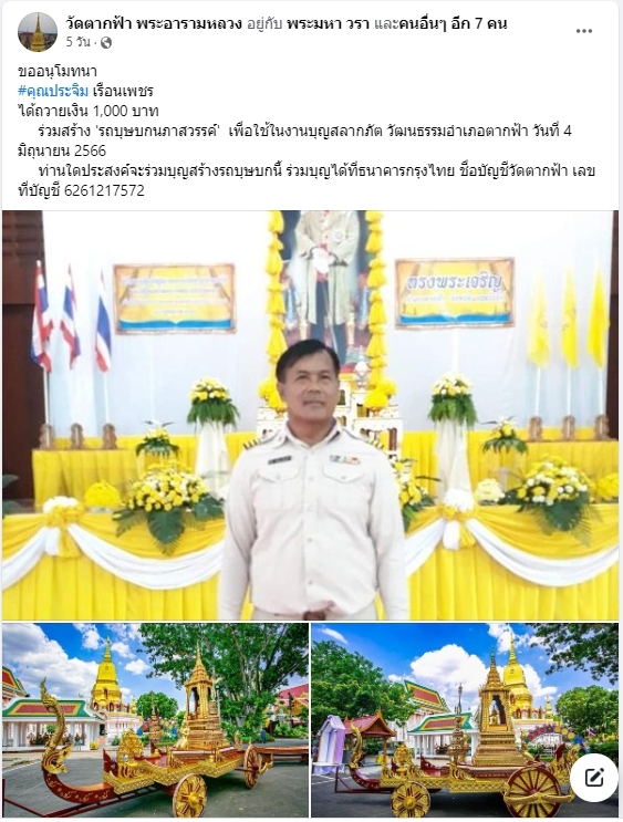 | ขออนุโมทนา คุณประจิม เรือนเพชร ถวายเงิน 1,000 บาท ร่วมสร้างบุษบกนภาสวรรค์ ถวายวัดตากฟ้า พระอารามหลวง | ||