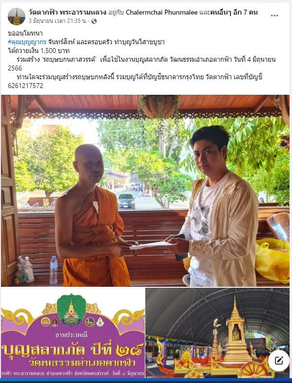 | ขออนุโมทนา คุณบุญญากร จันทร์สิงห์ และครอบครัว ถวายเงิน 1,500 บาท ร่วมสร้างบุษบกนภาสวรรค์ ถวายวัดตากฟ้า พระอารามหลวง | ||