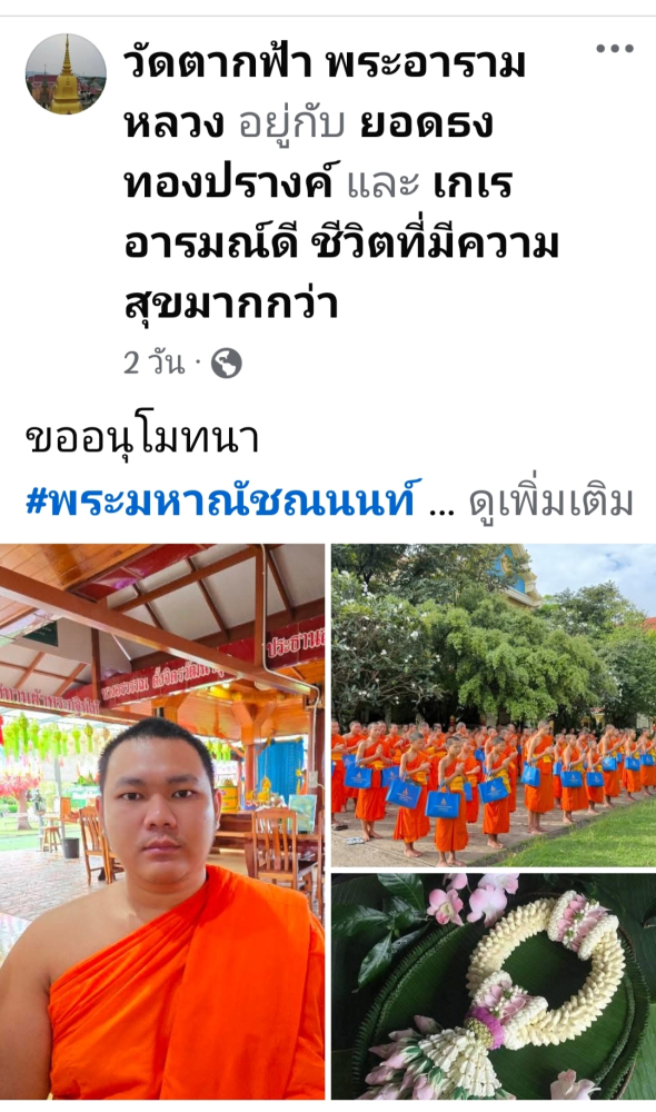 | ขออนุโมทนา พระมหาณํฐณนนท์ ถวายปัจจัย 1,000 บาท ทำบุญวันเกิด เข้ากองทุนพระราชทาน"กองทุนรัตนภัตต์" เพื่อส่งเสริมการศึกษาวัดตากฟ้าพระอารามหลวง | ||