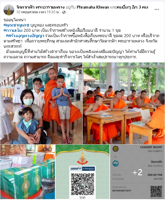 | ขออนุโมทนา คุณชาญเดช บุญทอง พร้อมครอบครัว ถวายเงิน 200 บาท เป็นเจ้าภาพสร้างหนังสือบาลี จำนวน 1 ชุด เพื่อถวายพระภิกษุ-สามเณรวัดตากฟ้า พระอารามหลวง | ||