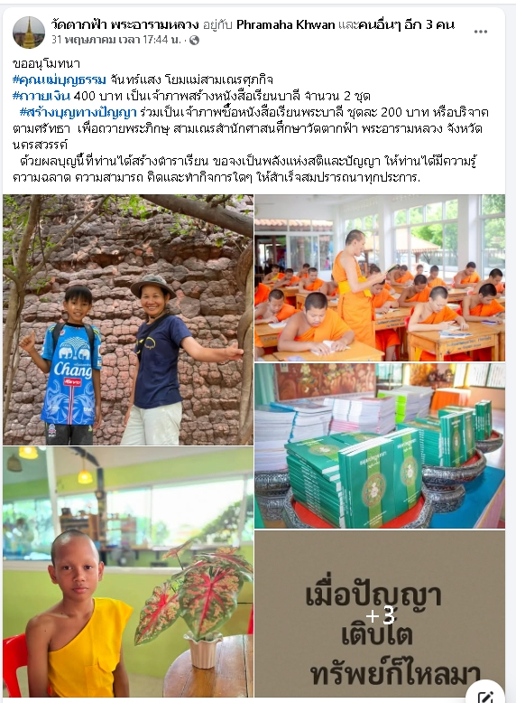 | ขออนุโมทนา คุณแม่บุญธรรม จันทร์แสง สามเณรศุภกิตติ์ เลนไธสง ถวายเงิน 400 บาท เป็นเจ้าภาพสร้างหนังสือบาลี จำนวน 2 ชุด เพื่อถวายพระภิกษุ-สามเณรวัดตากฟ้า พระอารามหลวง | ||