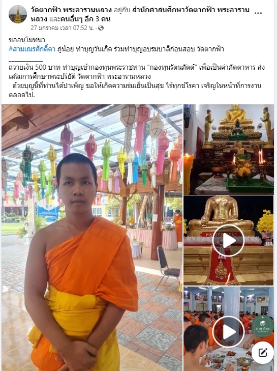 | ขออนุโมทนาบุญ พระมหาสัณฑยา ธีรธารี จต.อุดมธัญญา เขต 2 ถวายเงิน 1,000 บาท เข้ากองทุนพระราชทานกองทุนรัตนภัตต์ เพื่อเป็นค่าภัตตาหารส่งเสริมกรศึกษาพระปริยัติธรรมวัดตากฟ้าพระอารามหลวง | ||