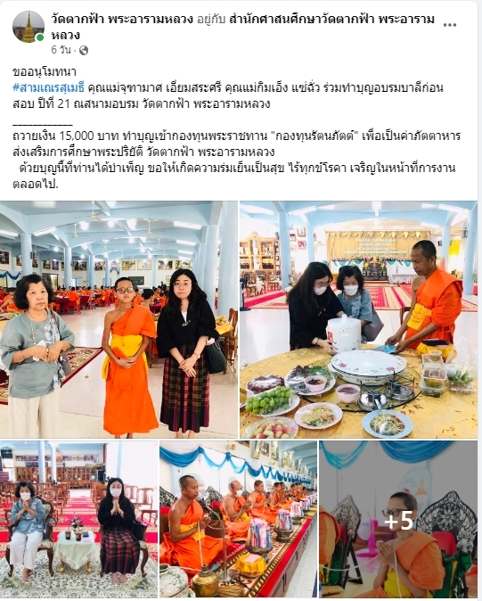 | ขออนุโมทนา สามเณรสุเมธี คุณแม่จุฑามาศ เอี่ยมสระศรี คุณแม่กิมเอ็ง แซ่ฉั่ว ถวายเงิน 15,000 บาท เข้ากองทุนรัตนภัตต์ เพื่อเป็นค่าภัตตาหารส่งเสริมการศึกษาพระปริยัติธรรมวัดตากฟ้า พระอารามหลวง | ||