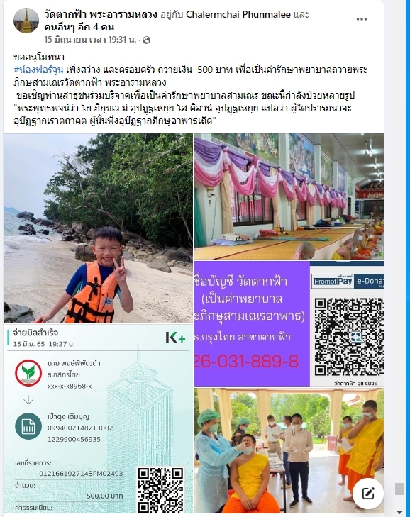 | ขออนุโมทนา คุณพงษ์พิพัฒน์ - คุณยุธิดา -น้องฟอร์จูน ถวายเงิน 500 บาท เพื่อเป็นค่ารักษาพยาบาลพระภิกษุสามเณรวัดตากฟ้า พระอารามหลวง | ||