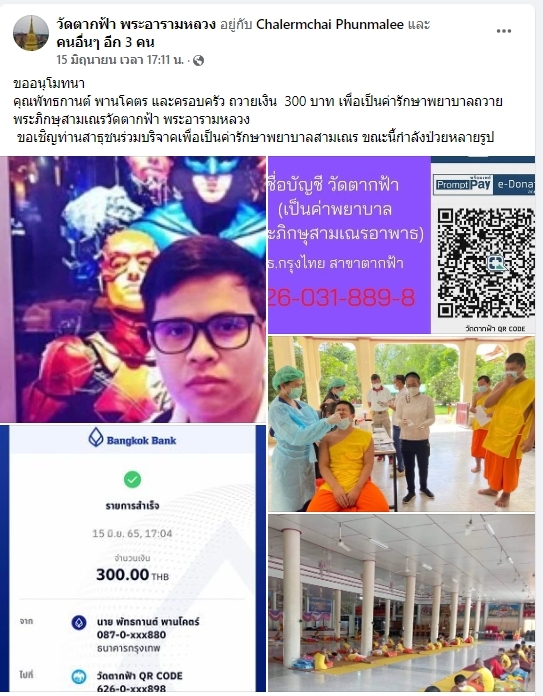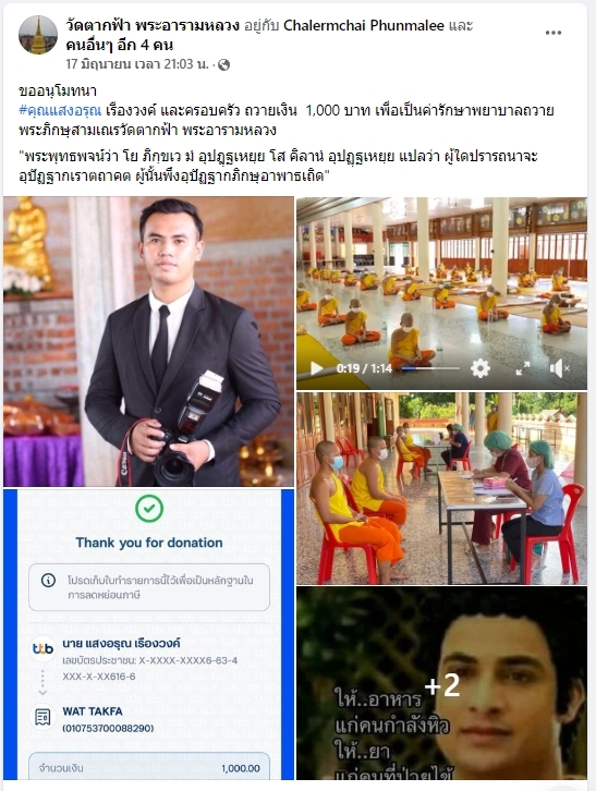 | ขออนุโมทนา คุณแสงอรุณ เรืองวงค์ และครอบครัว ถวายเงิน 1.000 บาท เพื่อถวายเป็นค่ารักษาพยาบาลพระภิกษุสามเณรวัดตากฟ้า พระอารามหลวง | ||
