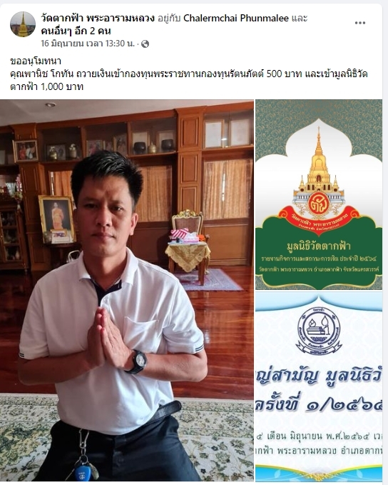 | ขออนุโมทนา คุณพานิช โกทัน ถวายเงิน 500 บาท เข้ากองทุนรัตนภัตต์เพื่อเป็นค่าภัตตาหาร และถวายเงิน 1,000 บาท เข้ามูลนิธิวัดตากฟ้า พระอารามหลวง | ||