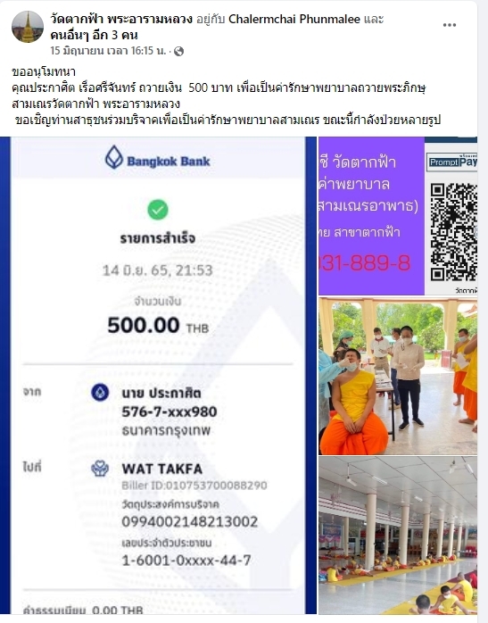 | ขออนุโมทนา คุณประกาศิต เรื่อศรีจันทร์ ถวายเงิน 500 บาท เพื่อเป็นค่ารักษาพยาบาลพระภิกษุสามเณรวัดตากฟ้า พระอารามหลวง | ||