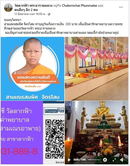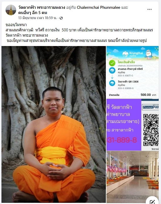 | ขออนุโมทนา สามเณรศักดาวุฒิ ทวีศรี ถวายเงิน 500 เพื่อเป็นค่ารักษาพยาบาลพระภิกษุ- สามเณรวัดตากฟ้า พระอารามหลวง | ||
