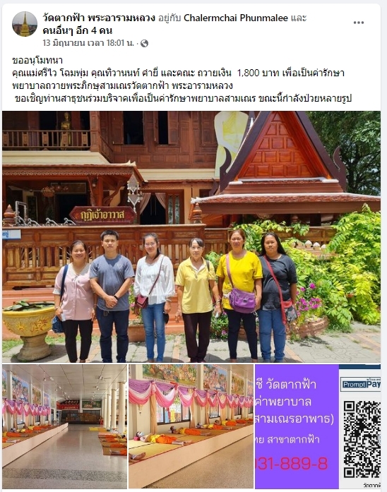 | ขออนุโมทนา คุณแม่ศรีวิไล-คุณทิวานนท์ คำยี่ และคณะ ถวายเงิน 1,800 บาท เพื่อเป็นค่ารักษาพยาบาลพระภิกษุ-สามเณรวัดตากฟ้าพระอารามหลวง | ||