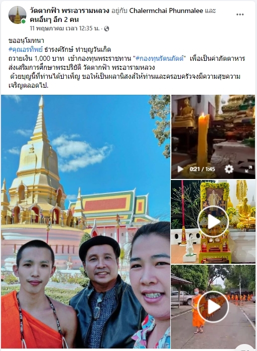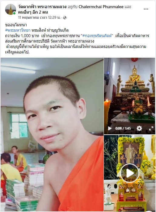 | ขออนุโมทนา พระมหาวิทยา อาภานนฺที ทำบุญวันเกิด ถวายเงิน 1,000 บาท เข้ากองทุนพระราชทาน กองทุนรัตนภัตต์ เพื่อเป็นค่าภัตตาหารส่งเสริมการศึกษาพระปริยัติธรรมวัดตากฟ้า พระอารามหลวง | ||