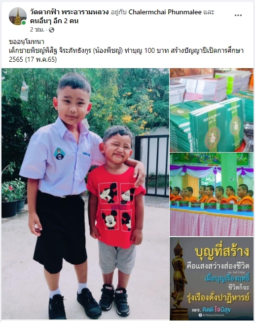 | ขออนุโมทนาบุญ เด็กชายพิชญ์พิสิฐ จิระภัทธังกูร ทำบุญหนังสือ 100 บาท สร้างปัญญาเปิดปีการศึกษา 2565 | ||