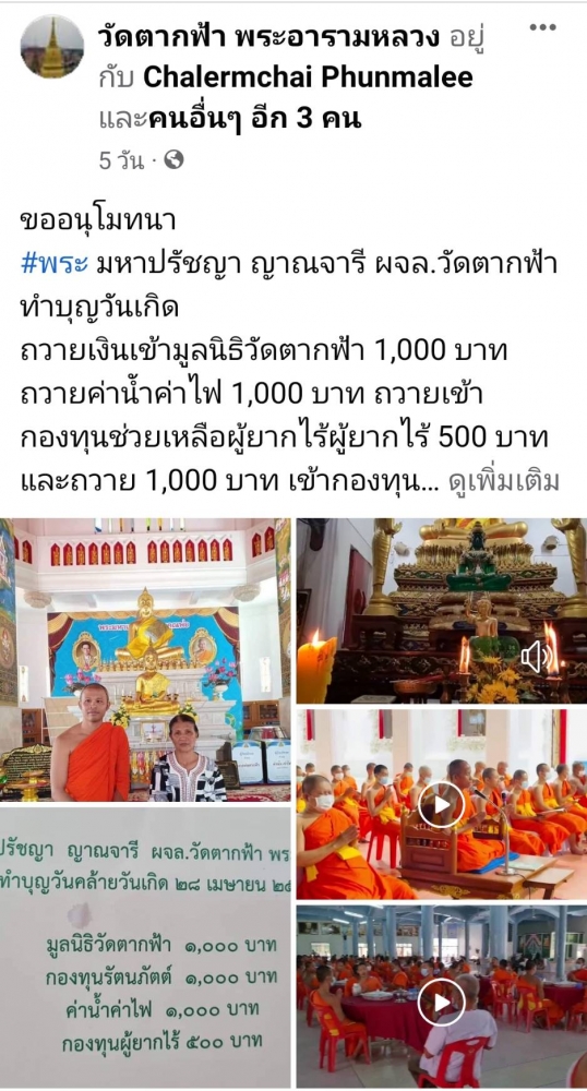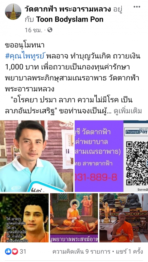 | ขออนุโมทนา นายไพทูรย์ พลอาจ ทำบุญวันเกิด ถวายเงิน 1,000 บาท เพื่อเป็นกองทุนค่ารักษาพยาบาลพระภิกษุสามเณรอาพาธ วัดตากฟ้า พระอารามหลวง | ||