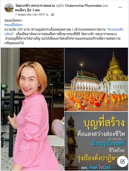 | ขออนุโมทนา คุณอ้อน สิริภัสสร ทำบุญประจำเดือนพฤษภาคม 2565 ถวายเงิน 200 บาท เข้ากองทุนพระราชทาน กองทุนรัตนภัตต์ เพื่อเป็นค่าภัตตาหารส่งเสริมการศึกษาพระปริยัติธรรมวัดตากฟ้า พระอารามหลวง | ||