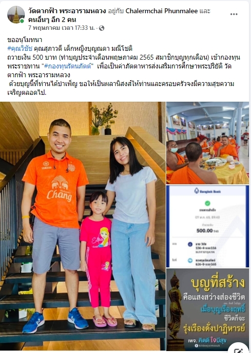 | ขออนุโมทนา คุณวิชัช -คุณสุภาวดี-ดญ.บุญณดา มณีโชติ ทำบุญประจำเดือนพฤษภาคม 2565 ถวายเงิน 500 บาท เข้ากองทุนพระราชทาน กองทุนรัตนภัตต์ เพื่อเป็นค่าภัตตาหารส่งเสริมการศึกษาพระปริยัติธรรมวัดตากฟ้า พระอารามหลวง | ||