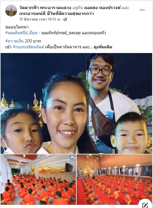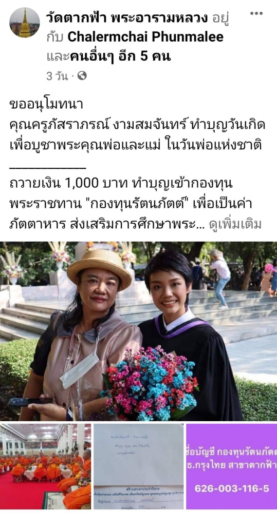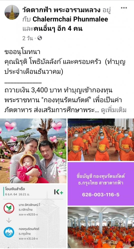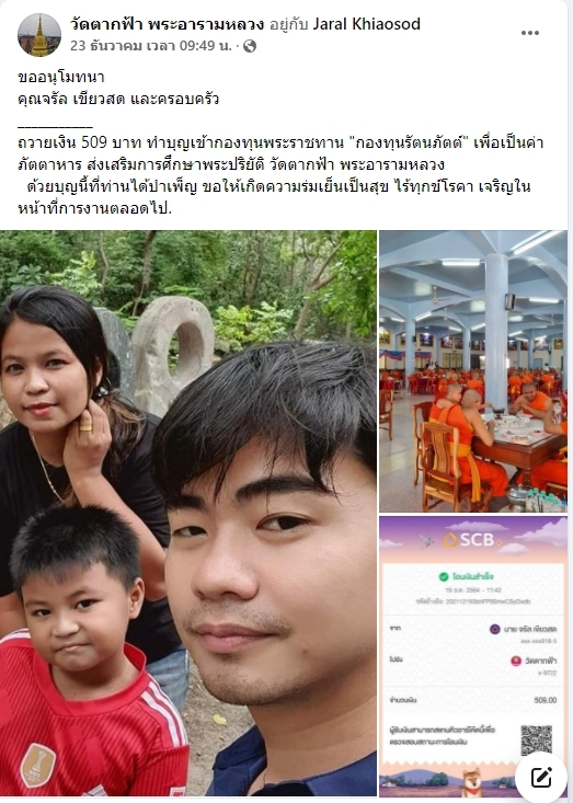 | คุณจรัล เขียวสด และครอบครัว ถวายเงิน 509 บาท เข้ากองทุนรัตนภัตต์ฒนเพื่อเป็นค่าภัตตาหารแด่พระภิกษุสามเณรวัดตากฟ้า พระอารามหลวง | ||