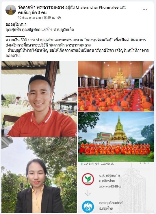 | คุณศุภชัย บุปผโสรส -คุณณัฐชนก แซ่จ้าง ทำบุญวันเกิด ถวายเงิน 500 บาท เข้ากองทุนรัตนภัตต์ เพื่อเป็นค่าภัตตาหาร ส่งเสริมการศึกษาพระปริยัติธรรม | ||