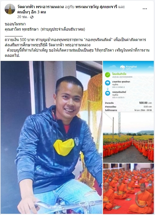 | คุณสาวิตร พุทธรักษา ทำบุญประจำเดือนธันวาคม ถวายเงิน 500 บาท ทำบัญเข้ากองทุนรัตนภัตต์ เพื่อเป็นค่าภัตตาหาร ส่งเสริมการศึกษาพระปริยัติธรรม | ||