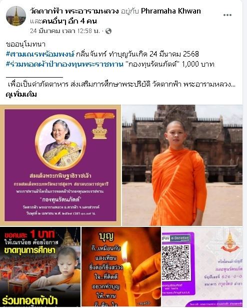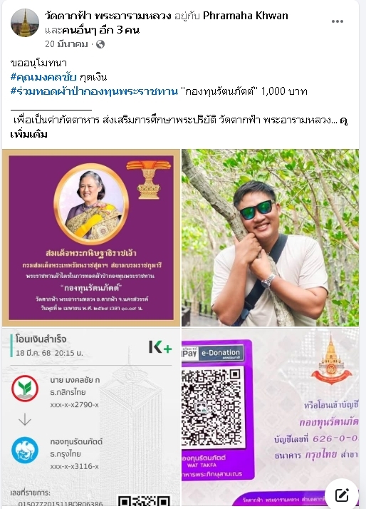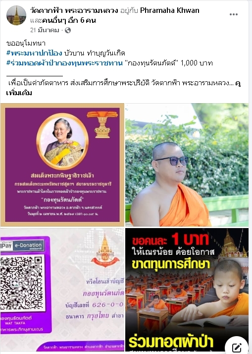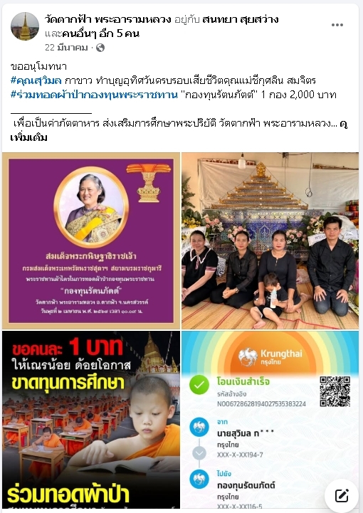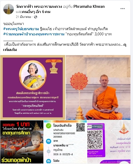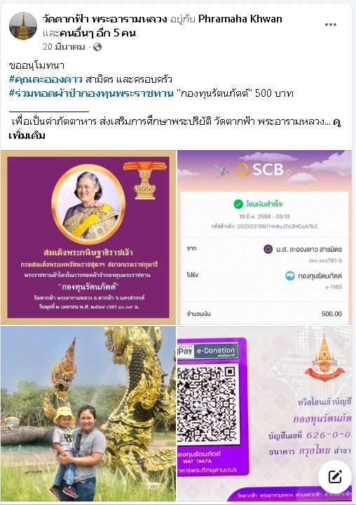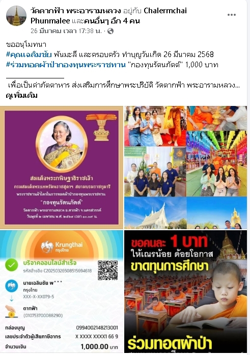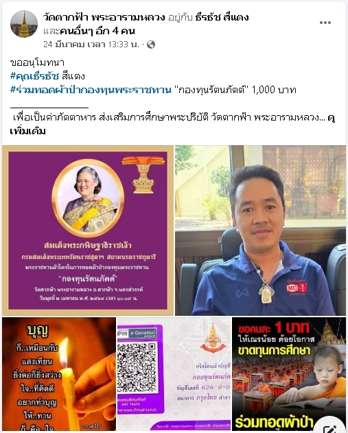 | ขออนุโมทนา คุณธีรธัช สีแตง ถวาย 1,000 บาท เข้ากองทุนพระราชทาน "กองทุนรัตนภัตต์" เพื่อเป็นค่าภัตตาหารแด่พระภิกษุสามเณรวัดตากฟ้า พระอารามหลวง | ||