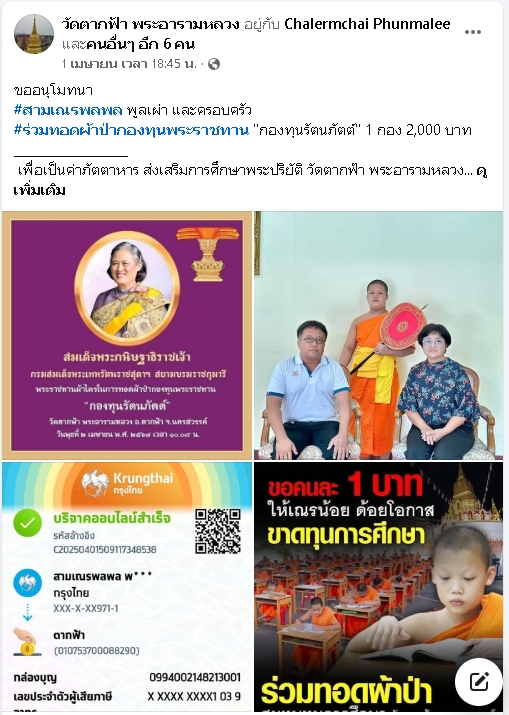 | ขออนุโมทนา สามเณรพิเชษฐ์ สำเภานนท์ ถวายเงิน 2,000 บาท เข้ากองทุนพระราชทาน กองทุนรัตนภัตต์ เพื่อเป็นค่าภัตตาหารส่งเสริมการศึกษาพระปริยัติธรรมวัดตากฟ้า พระอารามหลวง | ||