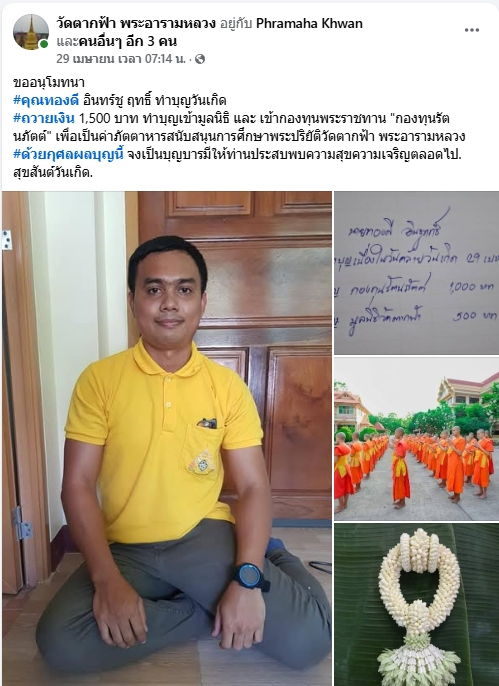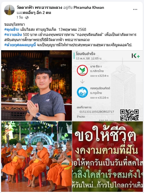 | ขออนุโมทนา คุณธีระ เลิบไธสง ทำบุญวันเกิด ถวายเงิน 500 บาท เข้ากองทุนพระราชทาน กองทุนรัตนภัตต์ เพื่อเป็นค่าภัตตาหารส่งเสริมการศึกษาพระปริยัติธรรมวัดตากฟ้า พระอารามหลวง | ||