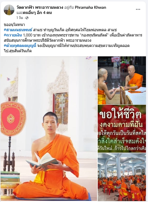 | ขออนุโมทนาสามเณรธนพนธ์ สาแช ทำบุญวันเกิด อุทิศให้คุณพ่อนพดล สาแช ถวายเงิน 1,000 บาท เข้ากองทุนพระราชทาน กองทุนรัตนภัตต์ เพื่อเป็นค่าภัตตาหารส่งเสริมการศึกษาพระปริยัติธรรมวัดตากฟ้า พระอารามหลวง | ||
