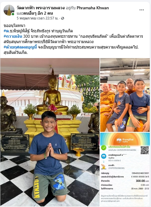| ขออนุโมทนา ด.ช.พิชญ์พิสิฐ จิระภัทธังกูร ทำบุญวันเกิด ถวายเงิน 300 บาท เข้ากองทุนพระราชทาน กองทุนรัตนภัตต์ เพื่อเป็นค่าภัตตาหารส่งเสริมการศึกษาพระปริยัติธรรมวัดตากฟ้า พระอารามหลวง | ||