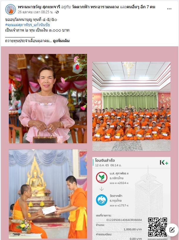 ขออนุโมทนาบุญ คุรแม่ศุภาพัชร -คุณพงษ์พิพัฒน์ พงษ์สว่าง เป็นเจ้าภาพ ถวายทุน 1,000 บาท เพื่อถวายกำลังสามเณรที่ศึกษาภาษาบาลี วัดตากฟ้า พระอารามหลวง | ||