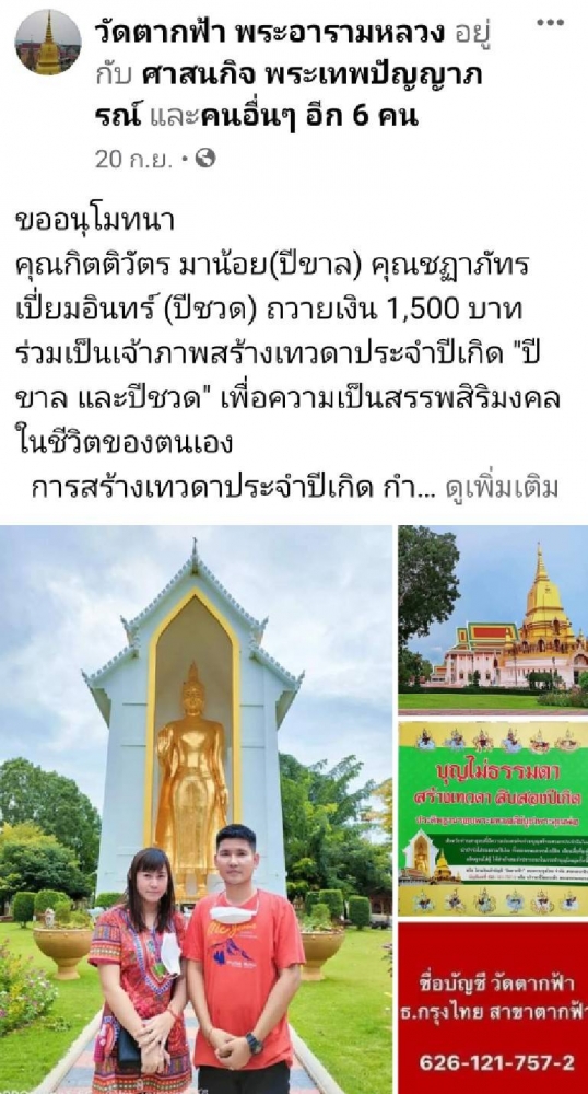 คุณกิตติวัตร มาน้อย -คุณชฎาภัทร เปี่ยมอินทร์ ถวายเงิน 1,500 บาท ร่วมเป็นเจ้าภาพสร้างเทวดาประจำปีเกิด | ||