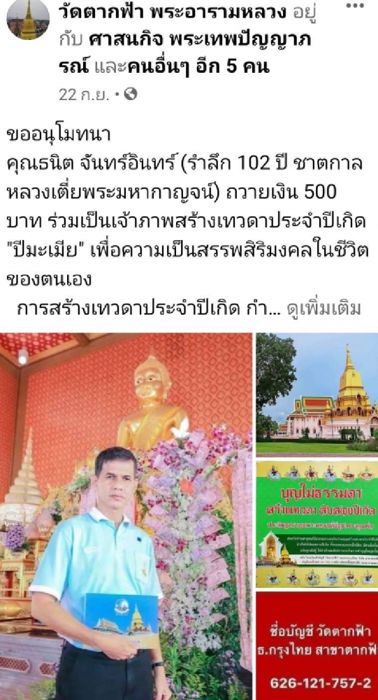 อาจารย์ธนิต จันทร์อินทร์ รำลึก 102 ปี ชาตกาลหลวงเตี่ยพระมหากาญจน์ ถวายเงิน 500 บาท ร่วมเป็น #เจ้าภาพสร้างเทวดาประจำปีเกิด (สร้างเทวดาปีมะเมีย) เพื่อความเป็นสรรพสิริมงคลในชีวิตของตนเอง | ||