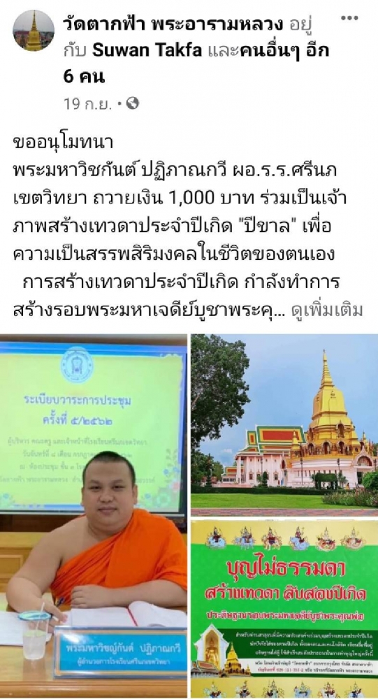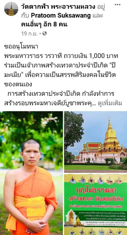 พระมหาวราธร วรวาที ถวายเงิน 1,000 บาท ร่วมเป็นเจ้าภาพสร้างเทวดาประจำปีเกิด | ||