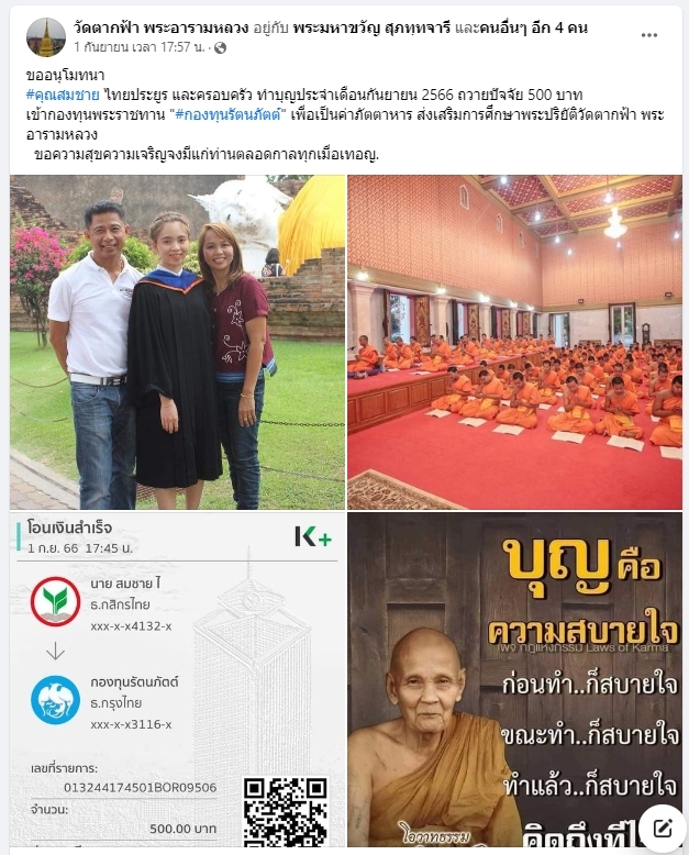 ขออนุโมทนา คุณสมชาย ไทยประยูร และครอบครัว ถวายปัจจัย 500 บาท เข้ากองทุนพระราชทานกองทุนรัตนภัตต์เพื่อเป็นค่าภัตตาหารส่งเสริมการศึกษาวัดตากฟ้า พระอารามหลวง | ||